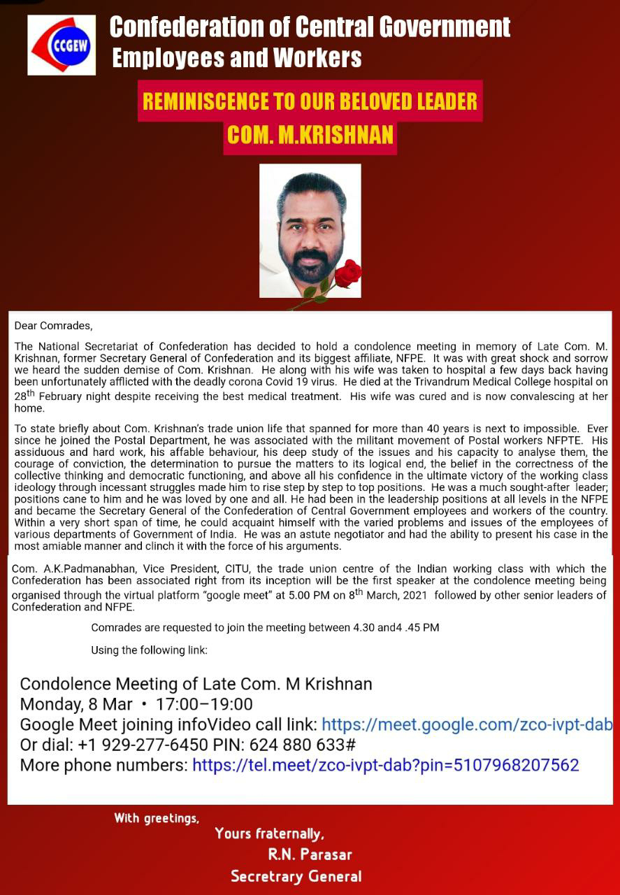 With deep sorrow we heard the sudden demise of com. M Krishnan, former Secretary General of Confederation of CGEs and workers and the NAtional Federation of Postal employees. He began his official service career in Govt. of India in Postal department. From the day one he chose to work for the workers and employees. His whole life was dedicated to them. Even after retirement from active service he remained in the forefront of the movement guiding the comrades. Being a member of the Chala area committee of CPI(M) he had the strenuous task of ensuring the victory of the LDF candidates in the last local body elections which was a very hotly contested one. He acquitted himself very creditably and demonstrated the fine organisational ability he possessed. He had the magnificent capacity to interact with people, convince them with his logical and matter of fact arguments and persuasion. Above all he was a good speaker both in Malayalam and English. There were innumerable occasions in which he could resolve the organisational problems with his persuasive ability. The CGE movement will miss this comrade for a very long time to come and his loss is certainly irreparable. Com. Krishnan was unfortunately afflicted with the deadly virus covid 19 along with his wife. Both were admitted to the hospital and given the best possible treatment but com. Krishnan ultimately succumbed. Mrs. Krishnan is recovering. NCCPA dips its flag in memory of this fine comrade and convey the heartfelt condolences of all its members , many of them had the opportunity to work with com. Krishnan to the bereaved members of his family. K.K.N. kutty. Secretary general NCCPA and Vice President, Confederation.